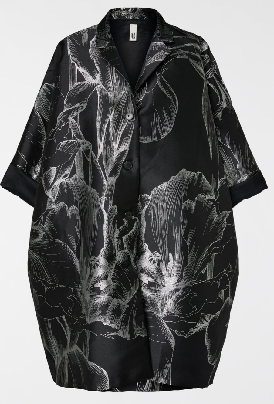 Stilingas švarkas didesnio dydžio, kuris dekoruotas blizgančiomis gėlėmis. Atrodo prabangiai.